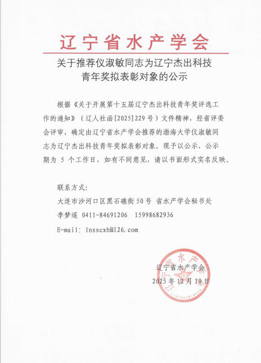 关于推荐仪淑敏同志为辽宁杰出科技青年奖拟表彰对象的公示