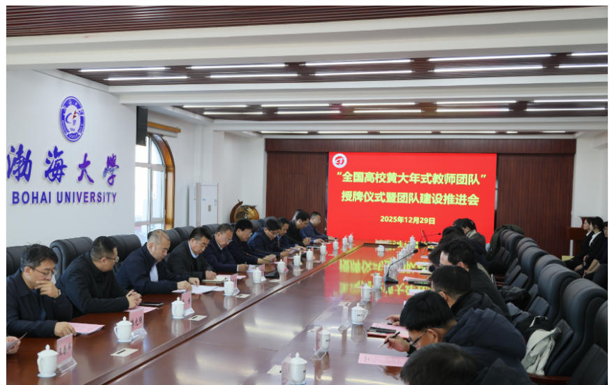 为深入贯彻落实习近平总书记对黄大年同志先进事迹的重要指示和给全国高校黄大年式教师团队代表的重要回信精神,进一步弘扬黄大年精神、表彰先进、分享经验、凝聚共识,扎实推进高水平科研团队建设。12月29日,渤海大学召开“全国高校黄大年式教师团队”授牌仪式暨团队建设推进会。党委书记丛茂国,党委副书记、校长赵建国,党委常委、副校长潘德昌,党委常委、副校长李学鹏,各二级学院院长、科研副院长、科研团队代表,人事处、科技处、学科处、教务处、大学科技园管理中心等职能部门负责人参加会议,会议由李学鹏主持。