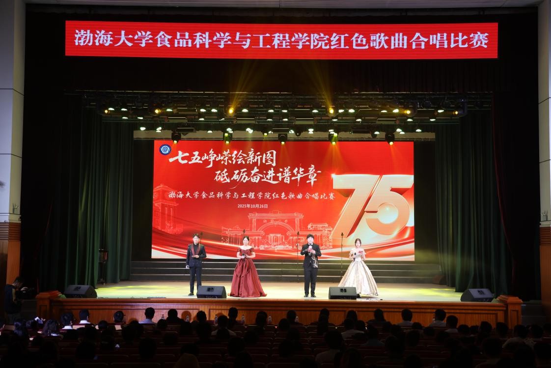 为庆祝党的二十届四中全会圆满落幕,10月26日,渤海大学食品科学与工程学院于音乐厅隆重举办“七五峥嵘绘新图、砥砺奋进谱华章”红色歌曲合唱比赛。全院师生以红色旋律为桥梁,深情演绎红色经典曲目,深刻厚植爱国情怀,凝聚砥砺前行的强大力量,为渤海大学第四次党代会献上了青春礼赞。
