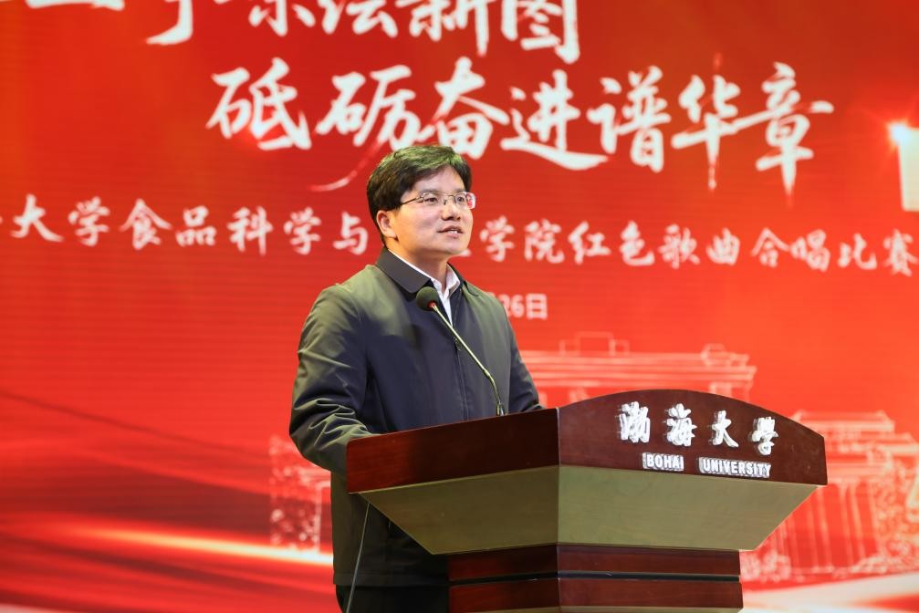渤海大学党委常委、副校长李学鹏代表学校出席活动并发表致辞。他在致辞中指出,红色旋律在礼堂内激荡回响,奋斗的星火穿越时空,再次在胸中燃起。一首首经典红歌重现了峥嵘岁月中的奋斗荣光;一幕幕精彩表演展现了食品学子的昂扬风貌。这不仅是一场音乐赛事,更是一堂生动的思想政治课,一次深刻的精神洗礼。